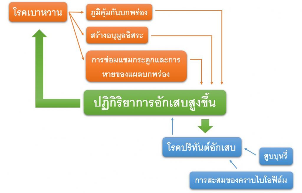 2) โรคเบาหวานทำให้การตอบสนองต่อการอักเสบลดลง เนื่องจาก