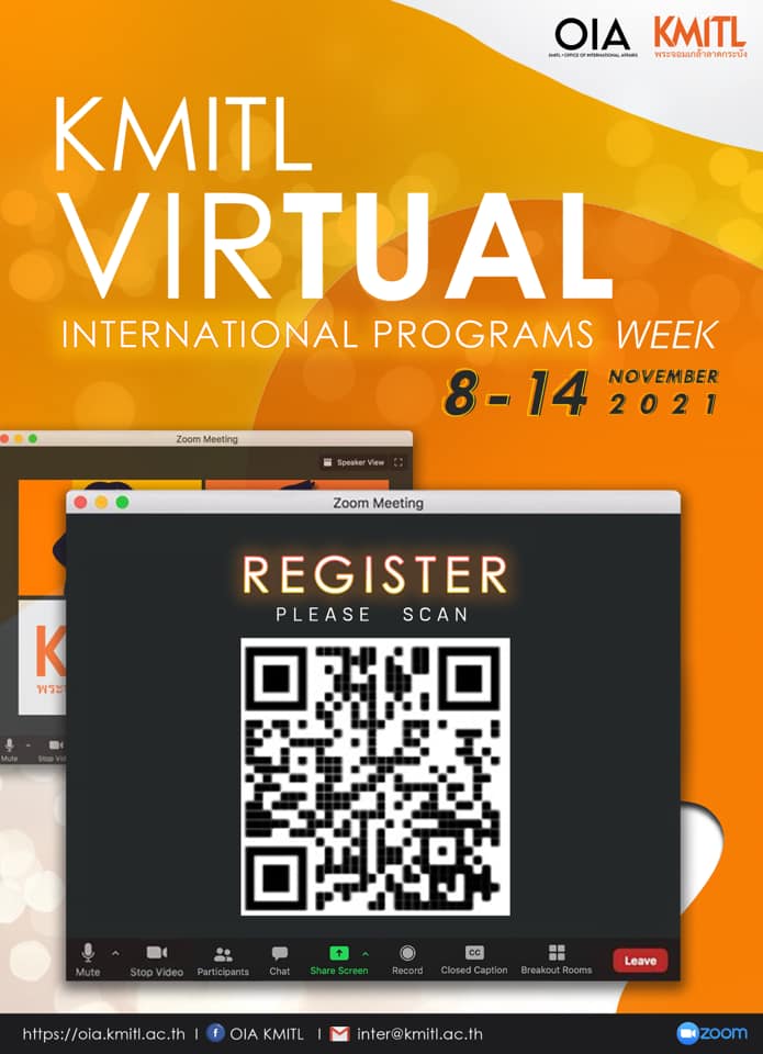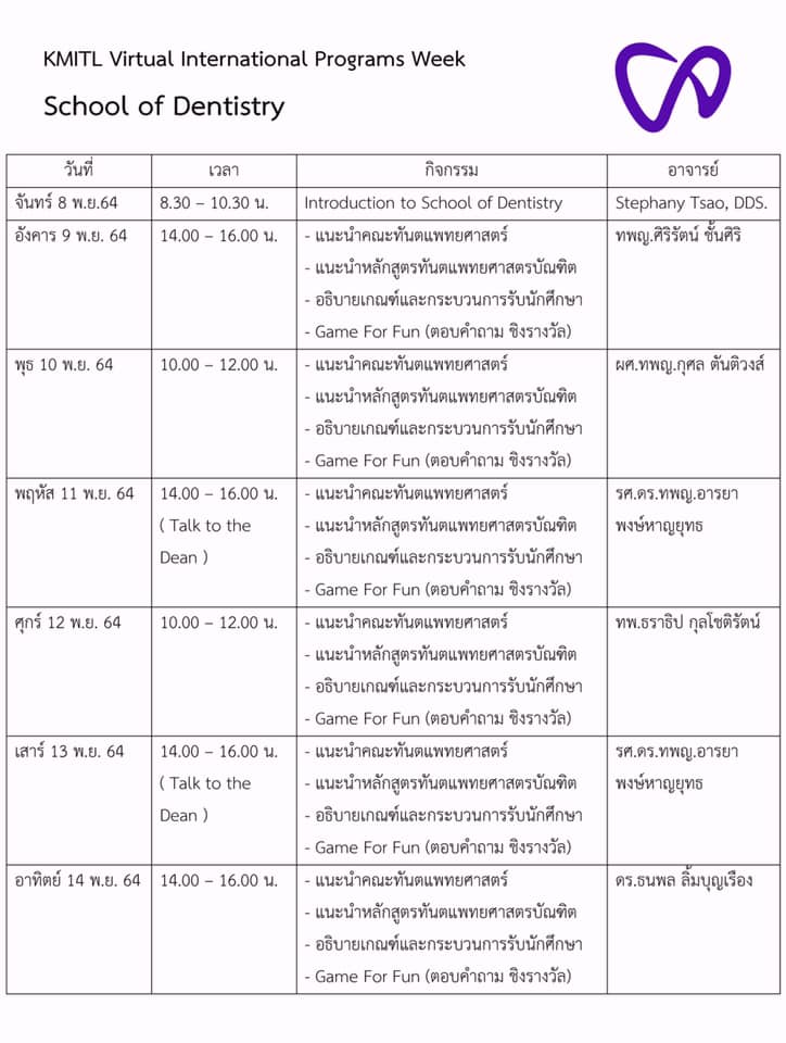 KMITL Virtual International Programs Week คณะทันตแพทยศาสตร์ได้เข้าร่วมกิจกรรม KMITL Virtual International Programs Week ซึ่งจะจัดขึ้นในวันที่ 8 - 14 พฤศจิกายน 2564 โดยจะมีการแนะนำคณะ หลักสูตร และเกณฑ์การรับสมัครนักศึกษา ผ่านช่องทาง Zoom application ขอเชิญผู้ที่สนใจทุกท่านลงทะเบียนผ่าน QR code เพื่อเข้าร่วมฟังและสอบถามข้อสงสัยต่าง ๆ โดยท่านสามารถเลือกเข้าร่วมได้ตามวันและเวลาที่ระบุไว้ในตารางกิจกรรม