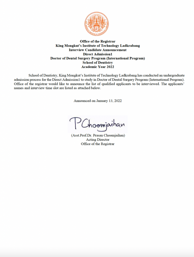 ประกาศผู้สิทธิ์สอบสัมภาษณ์ประจำปีการศึกษา 2565 หลักสูตรทันตแพทยศาสตร์บัณฑิต (นานาชาติ) สถาบันเทคโนโลยีพระจอมเกล้าเจ้าคุณทหารลาดกระบัง ประกาศผู้สิทธิ์สอบสัมภาษณ์ประจำปีการศึกษา 2565 หลักสูตรทันตแพทยศาสตร์บัณฑิต (นานาชาติ) สถาบันเทคโนโลยีพระจอมเกล้าเจ้าคุณทหารลาดกระบัง
