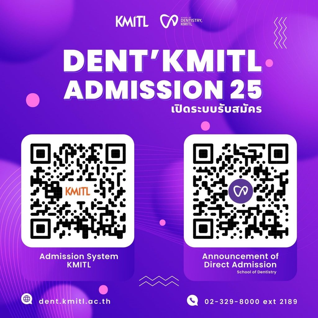 KMITL Admissions 2ïļâĢ0ïļâĢ2ïļâĢ5ïļâĢ information is here! ðŦ Admissions System >> Scan to access the registration system, or click the link below. https://new.reg.kmitl.ac.th/admission/#/ ðĶ· School of Dentistry >> Scan to view more details and the announcement of direct admission, or click the link below. https://reg.kmitl.ac.th/TCAS_old/news/files/2568_1_news1_3580_2024_11_06-09-21-45_4add7.pdf âĻ Hurry up and apply to join the exciting student life …
